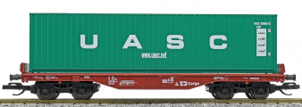 | plošinový nákladní vůz červenohnědý s nákladem 40' kontejneru „UACS“ |
