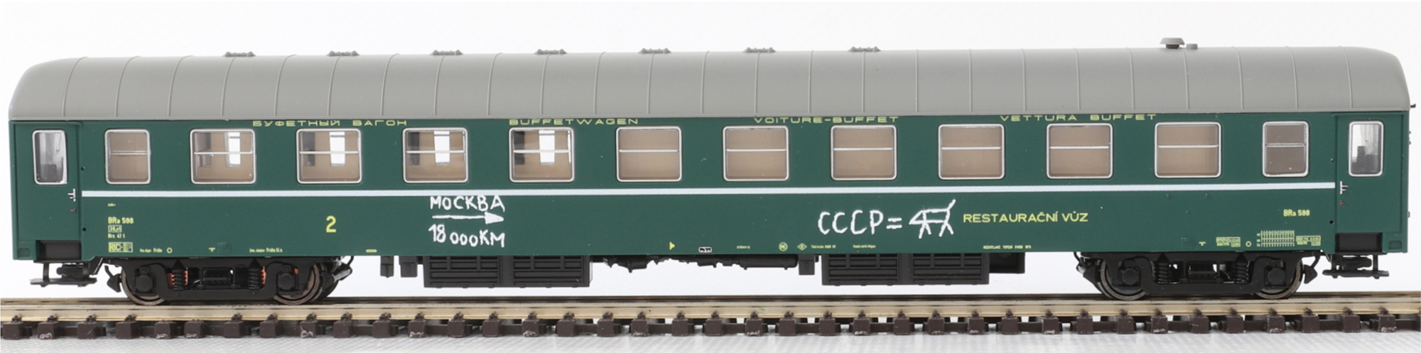 | restaurační vůz zelený s šedou střechou 2. tř., Praha |
