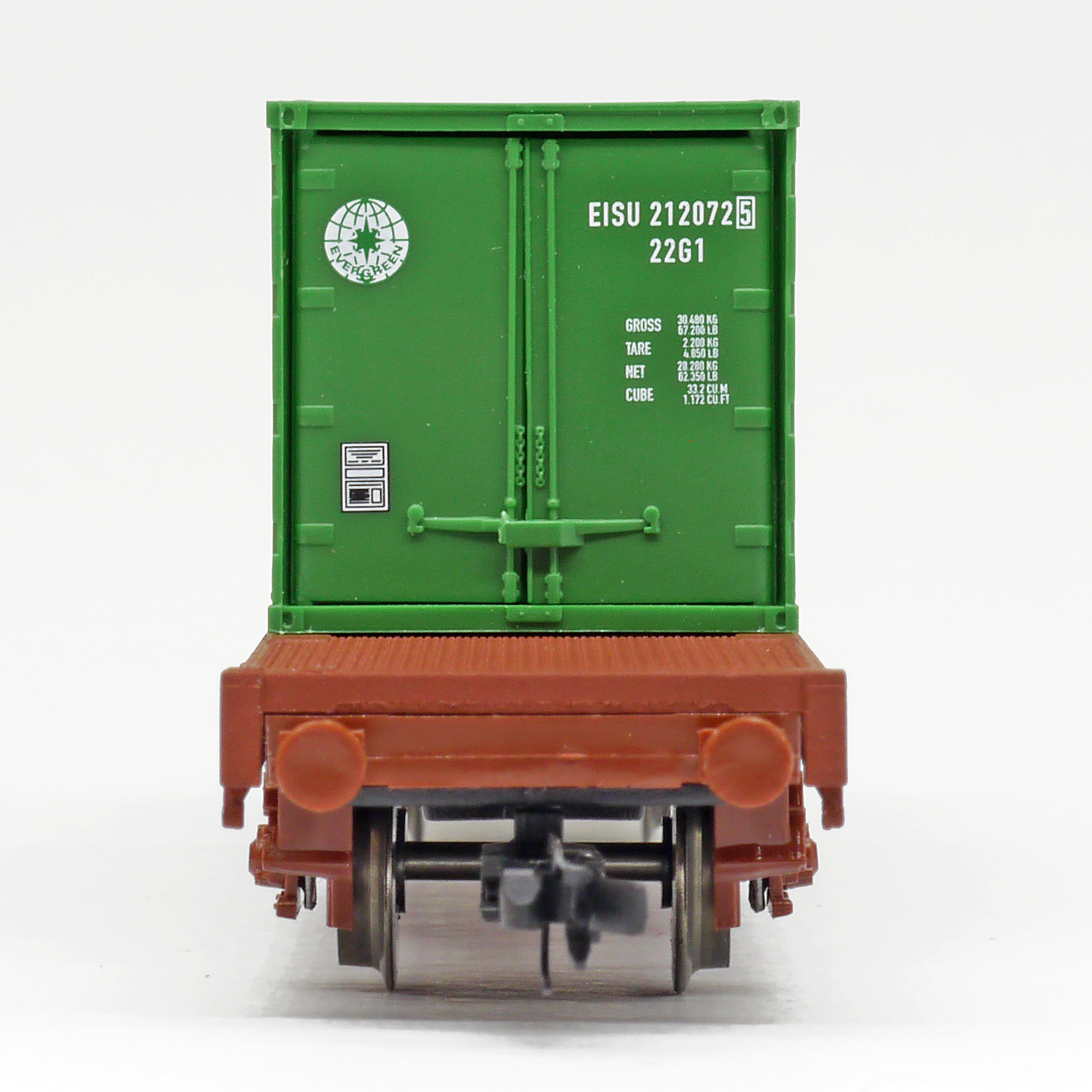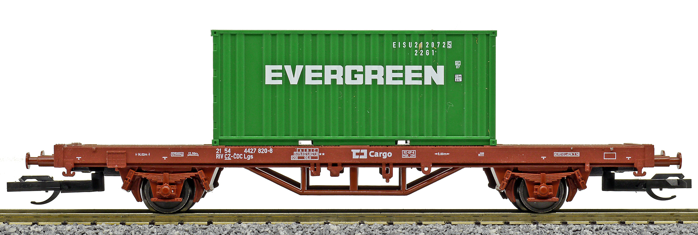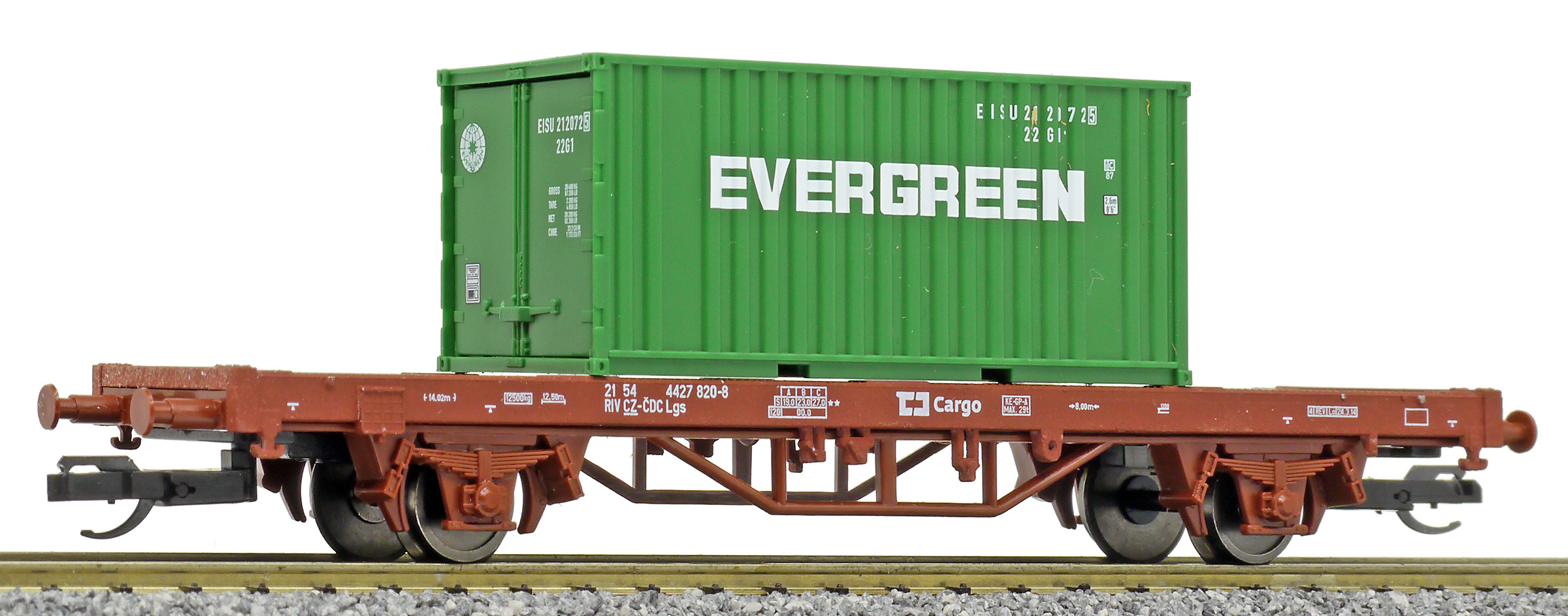 | plošinový vůz červenohnědý s nákladem 1x 20' kontejneru „EVERGREEN“ |