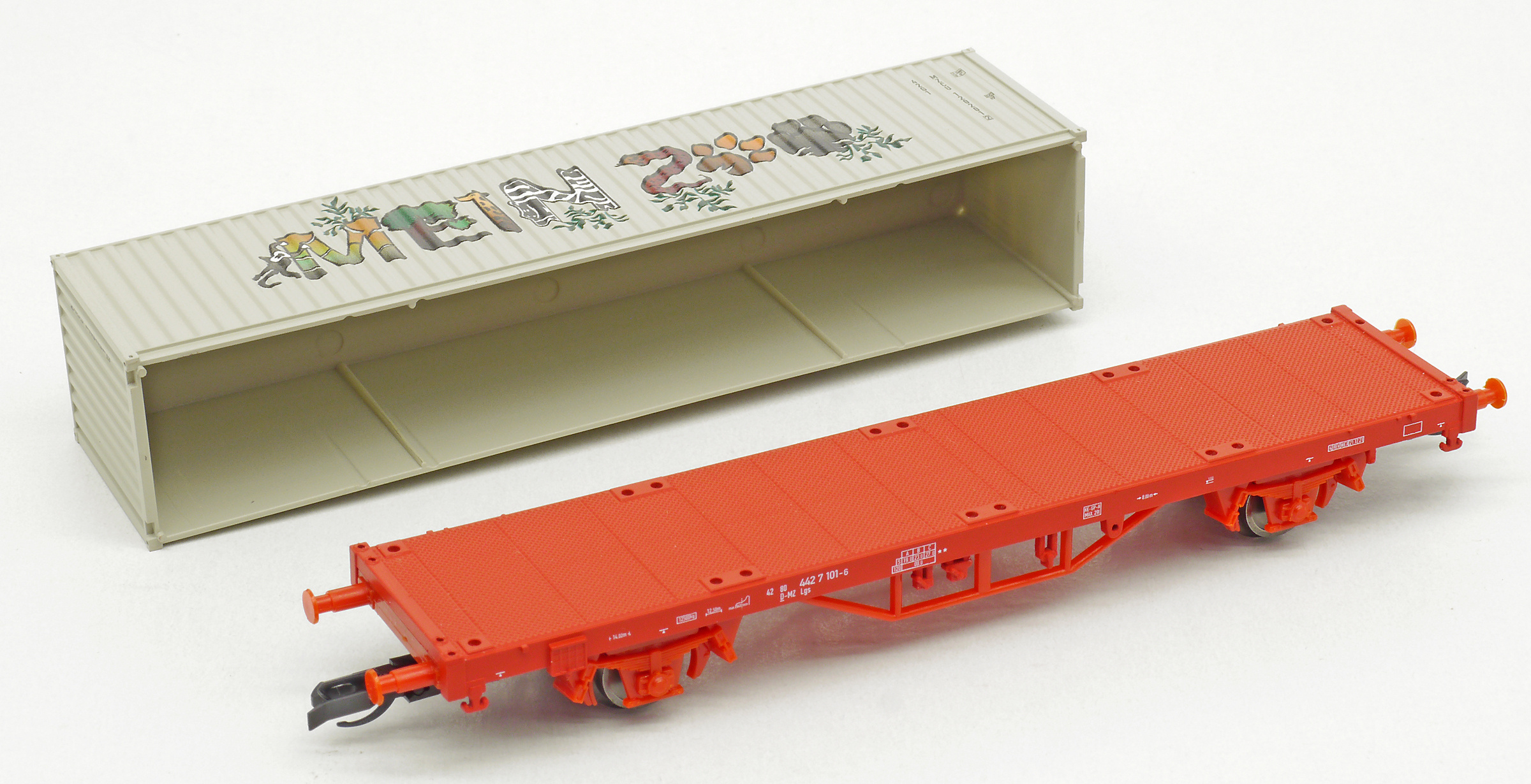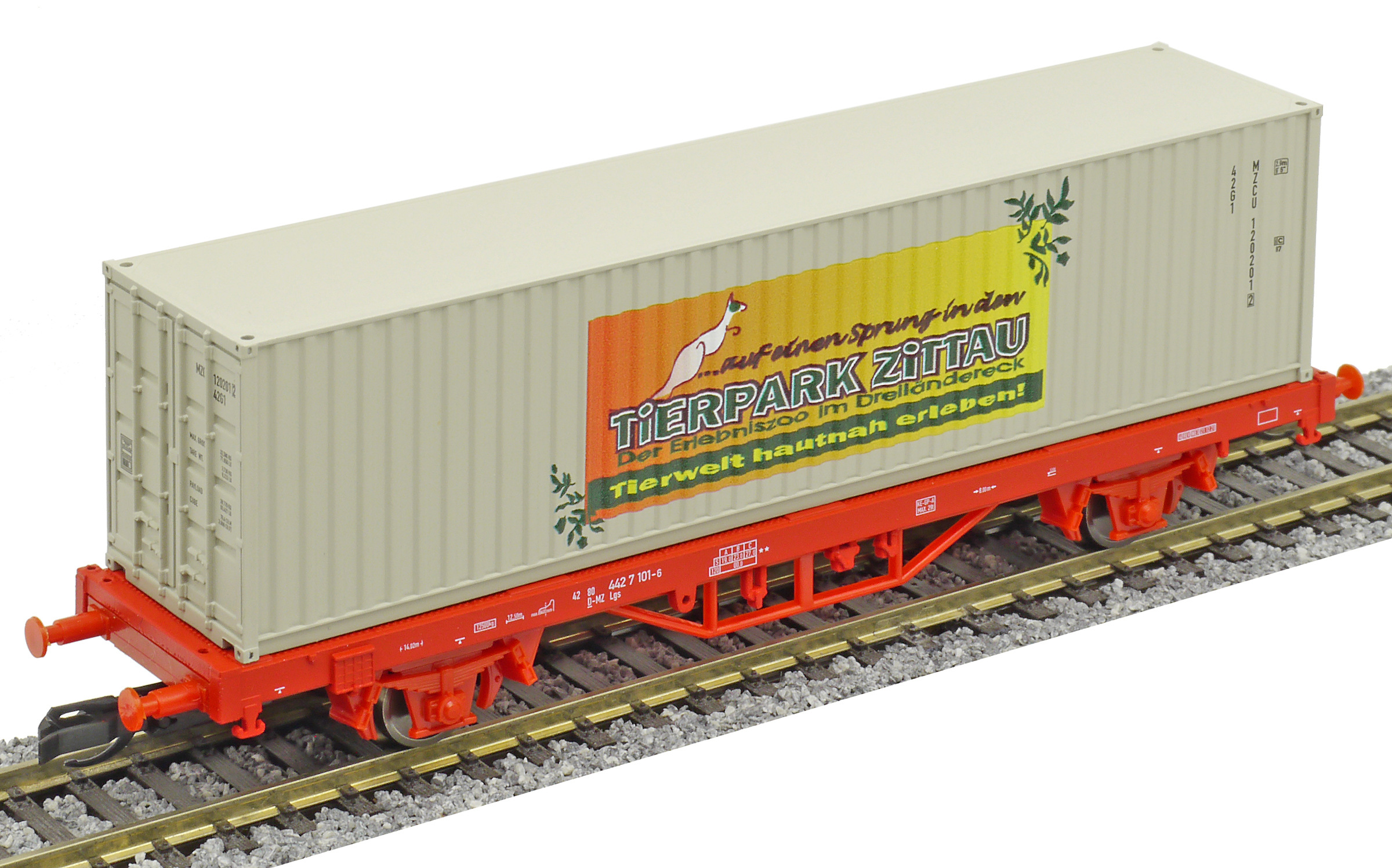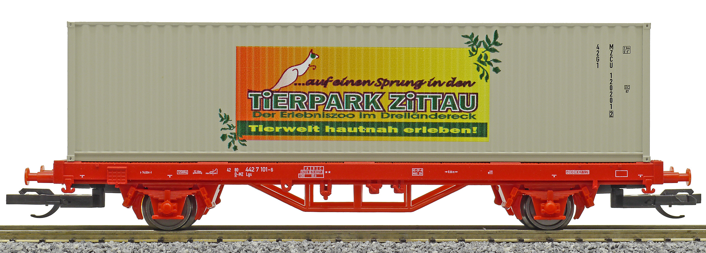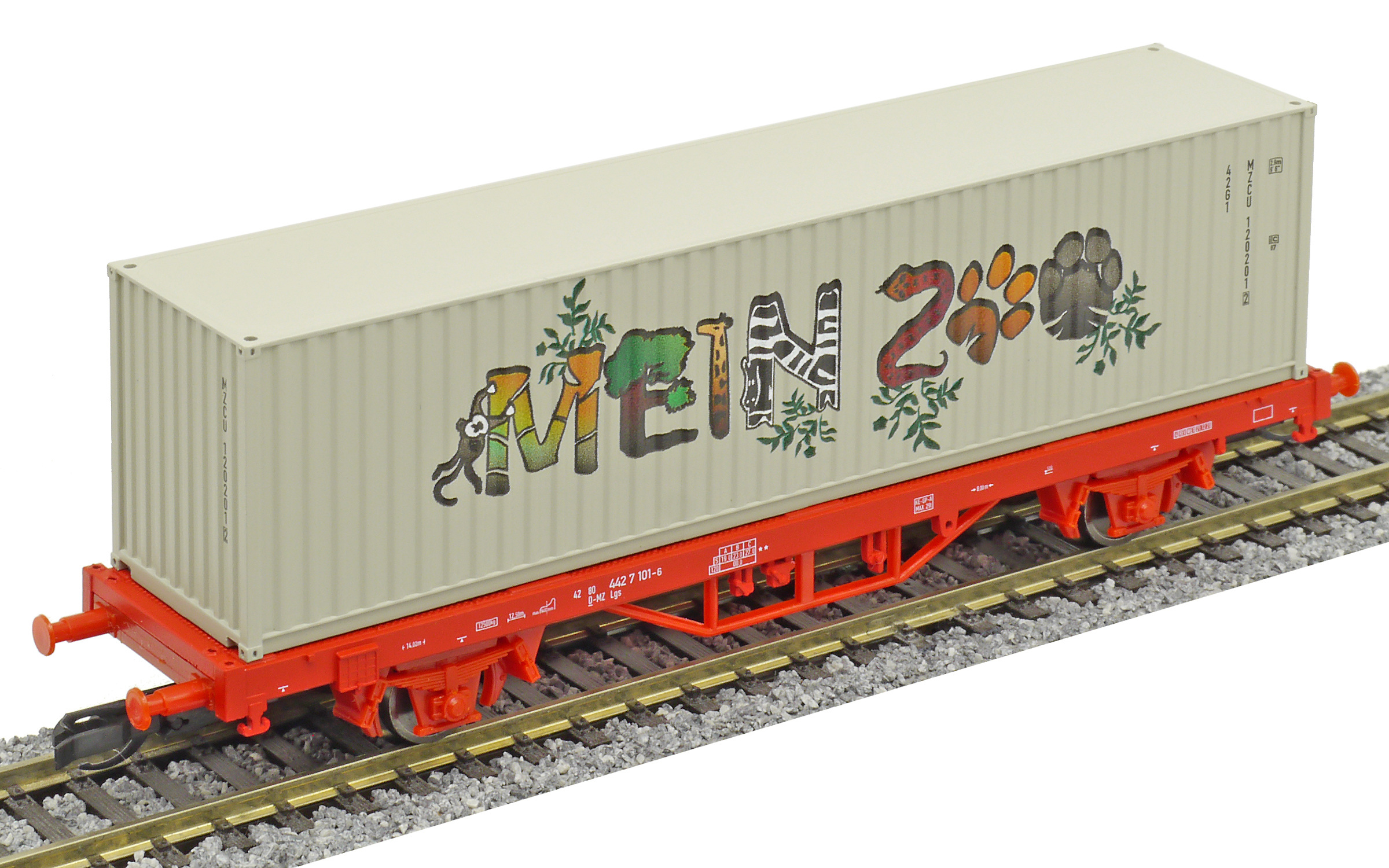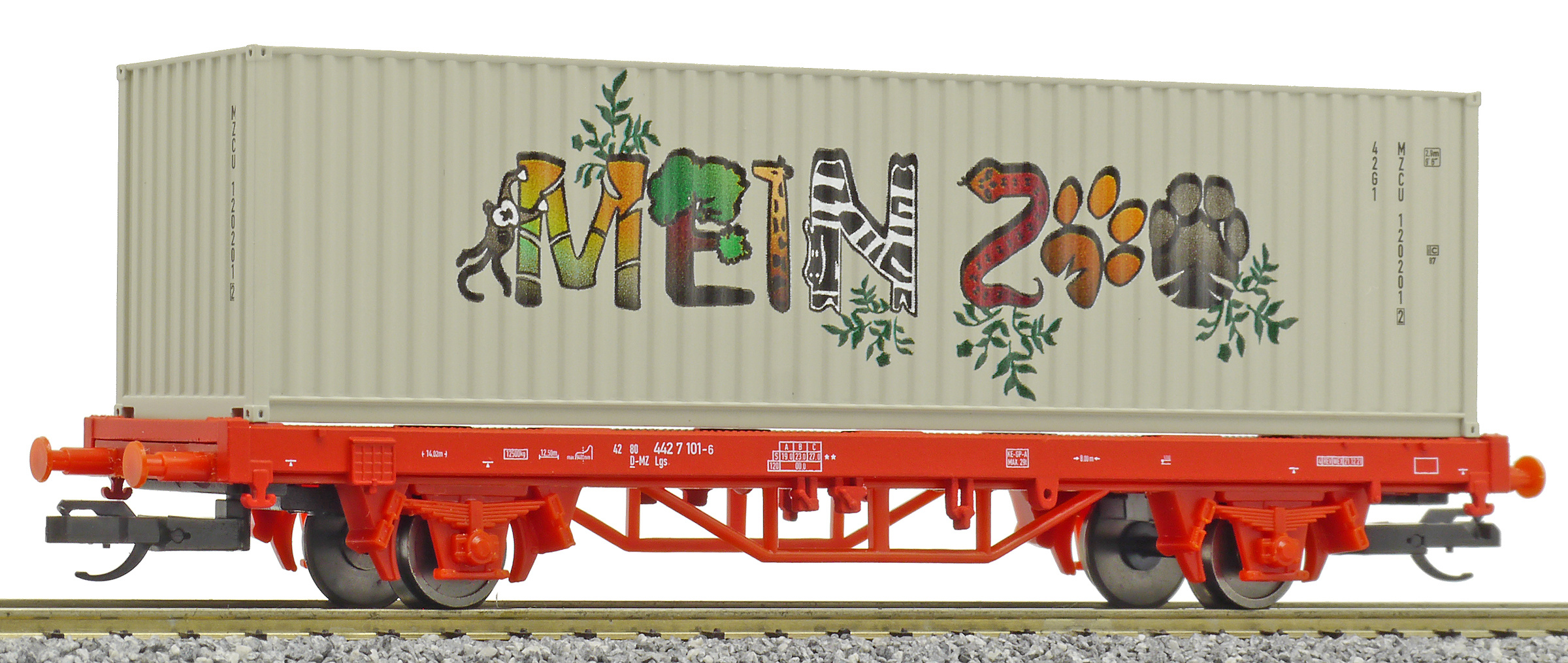 | plošinový vůz modrý s nákladem 1x 40' kontejneru „MainZoo“ |