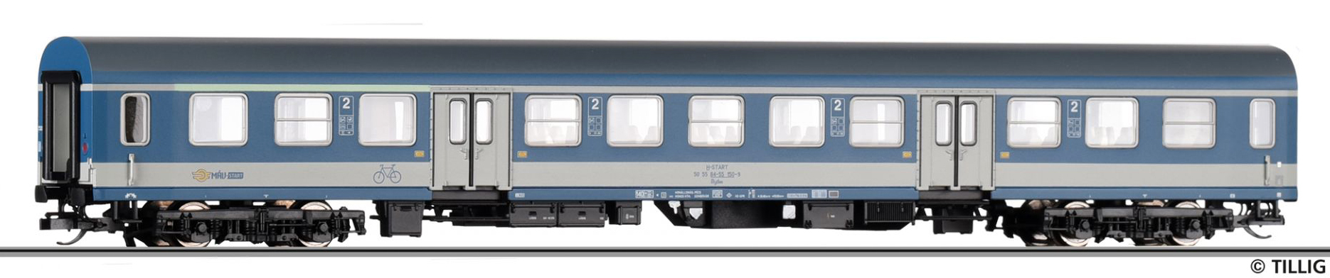 | osobní vůz modrý s šedou střechou a bílým pásem 2. tř. s oddílem na přepravu kol |