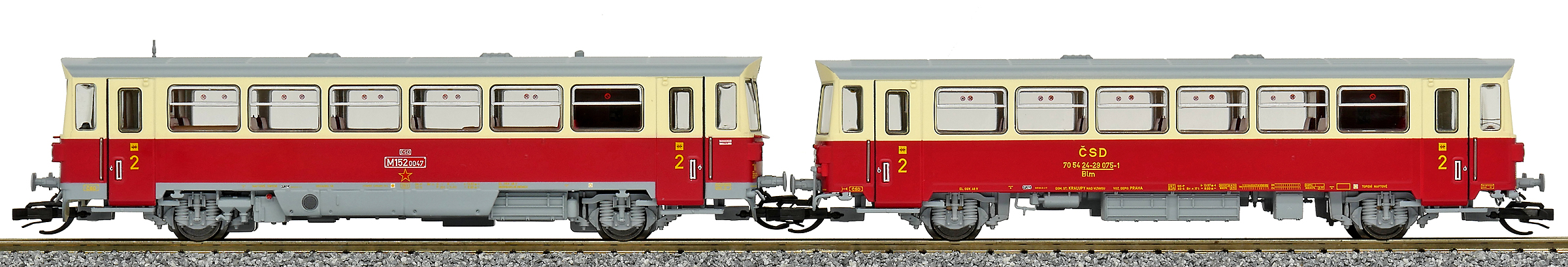 | motorový vůz s přípojným vozem v barvách červený-slonová kost s šedou střechou |