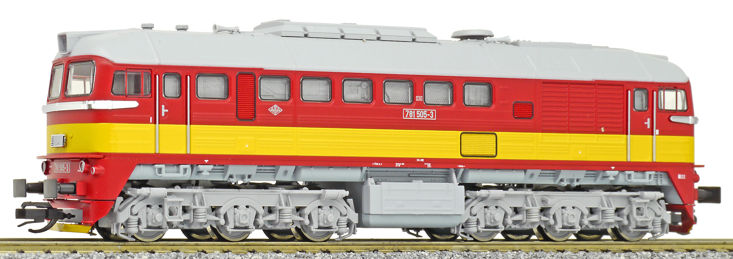 | dieselová lokomotiva červená se žlutým výstražným pruhem, šedá střecha a pojezd |