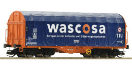 | plošinový vůz oranžový s odsuvnou modrou plachtou „Wascosa“ |