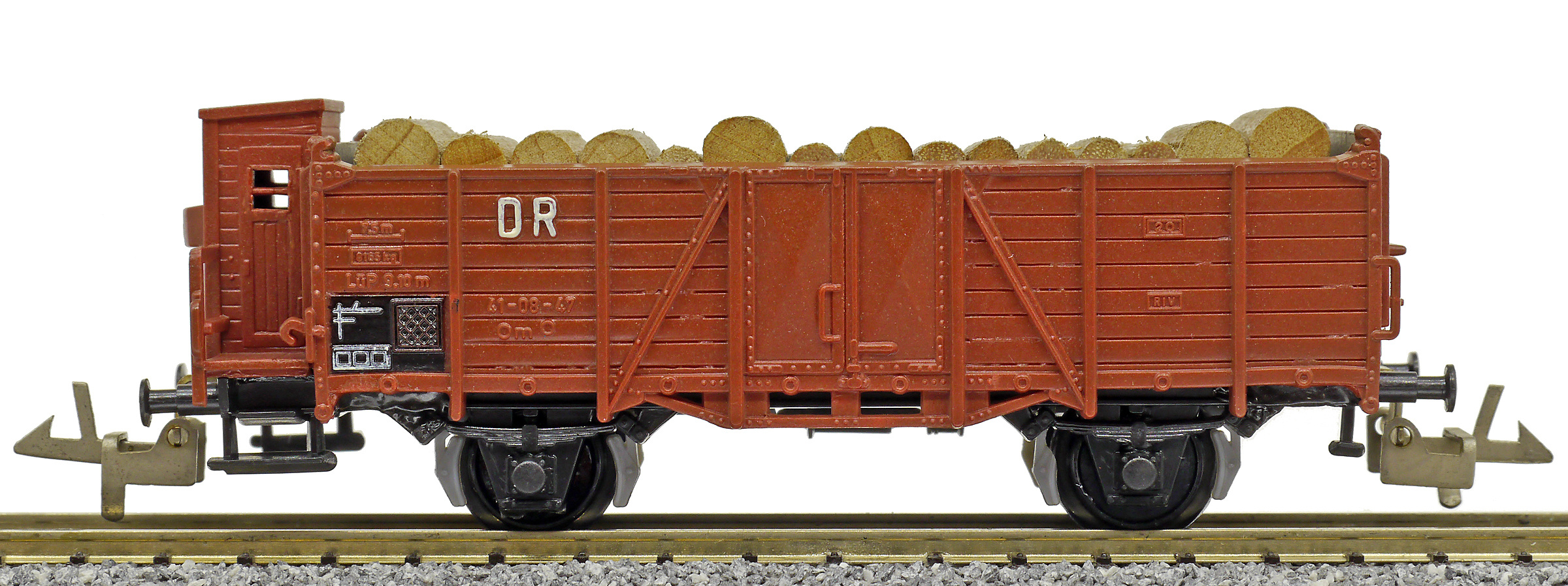 | otevřený nákladní vůz červenohnědý s brzdařskou budkou ložený kulatinou |