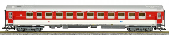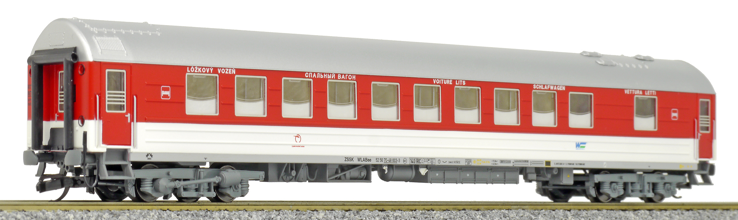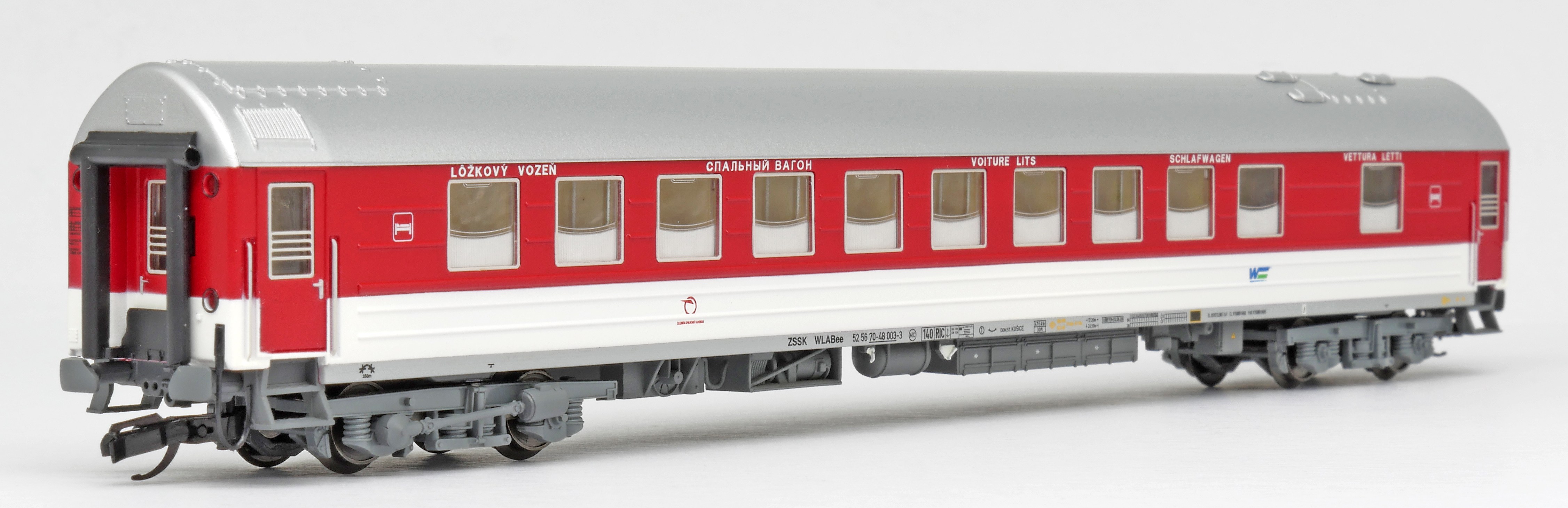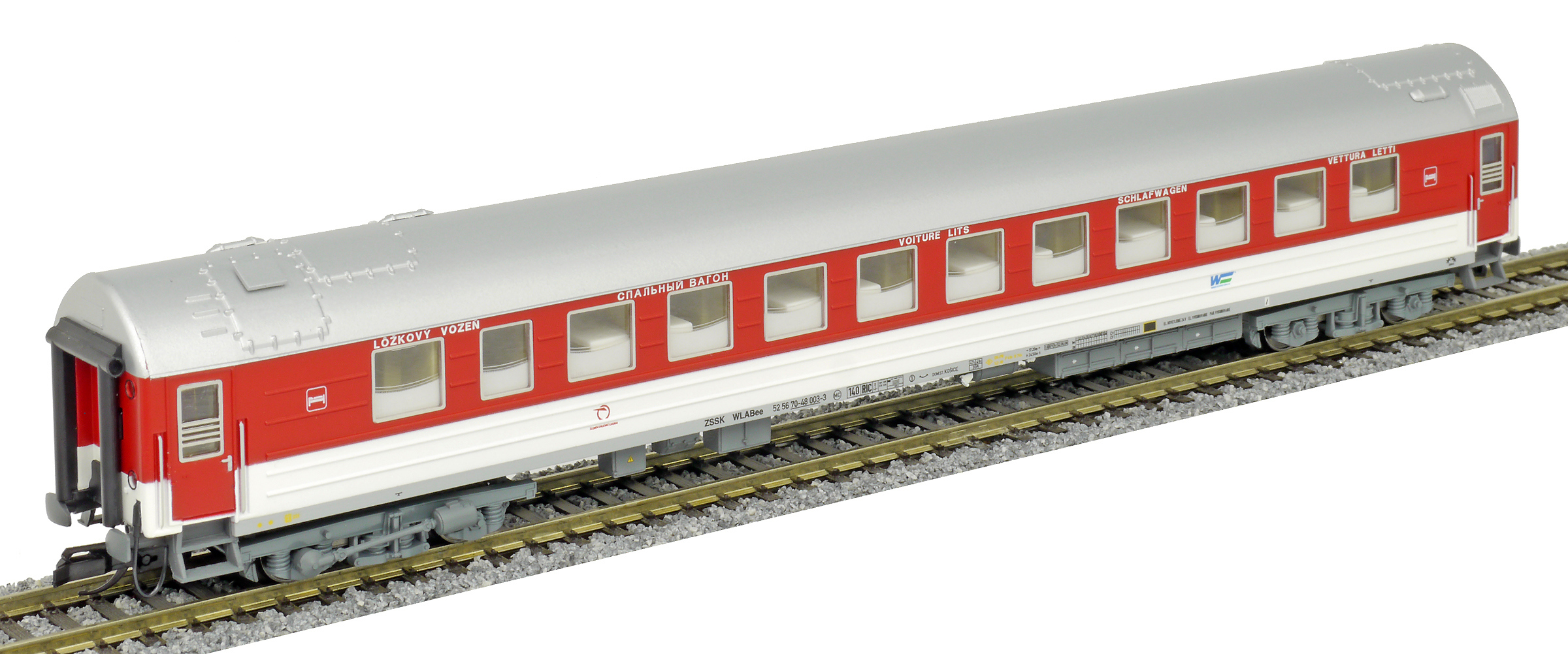 | lůžkový vůz červený-bílý s stříbřitou střechou |