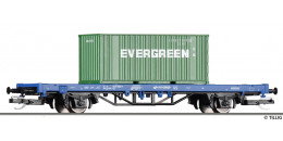 | plošinový vůz modrý s nákladem 1x 20' kontejneru „EVERGREEN“ |