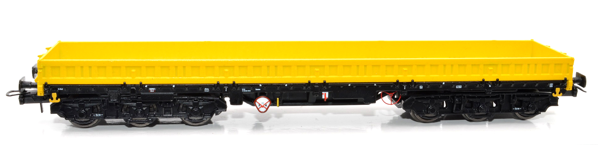 Popis   nízkostěnný nákladní vůz žlutý s černým rámem „Bahnbau Gruppe“