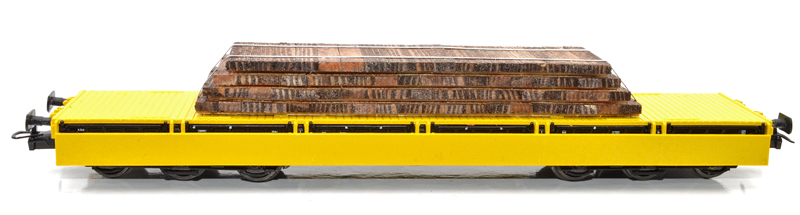 Popis   nízkostěnný nákladní vůz žlutý se sklopenými bočnicemi „Bahnbau Gruppe“