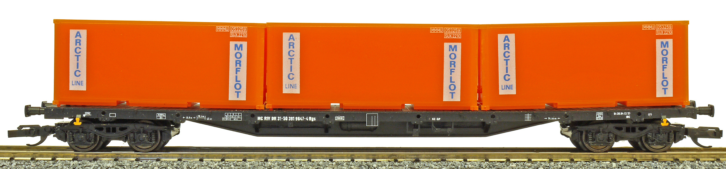 | nákladní plošinový vůz černý se třemi kontejnery 20' „MORFLOT“ |