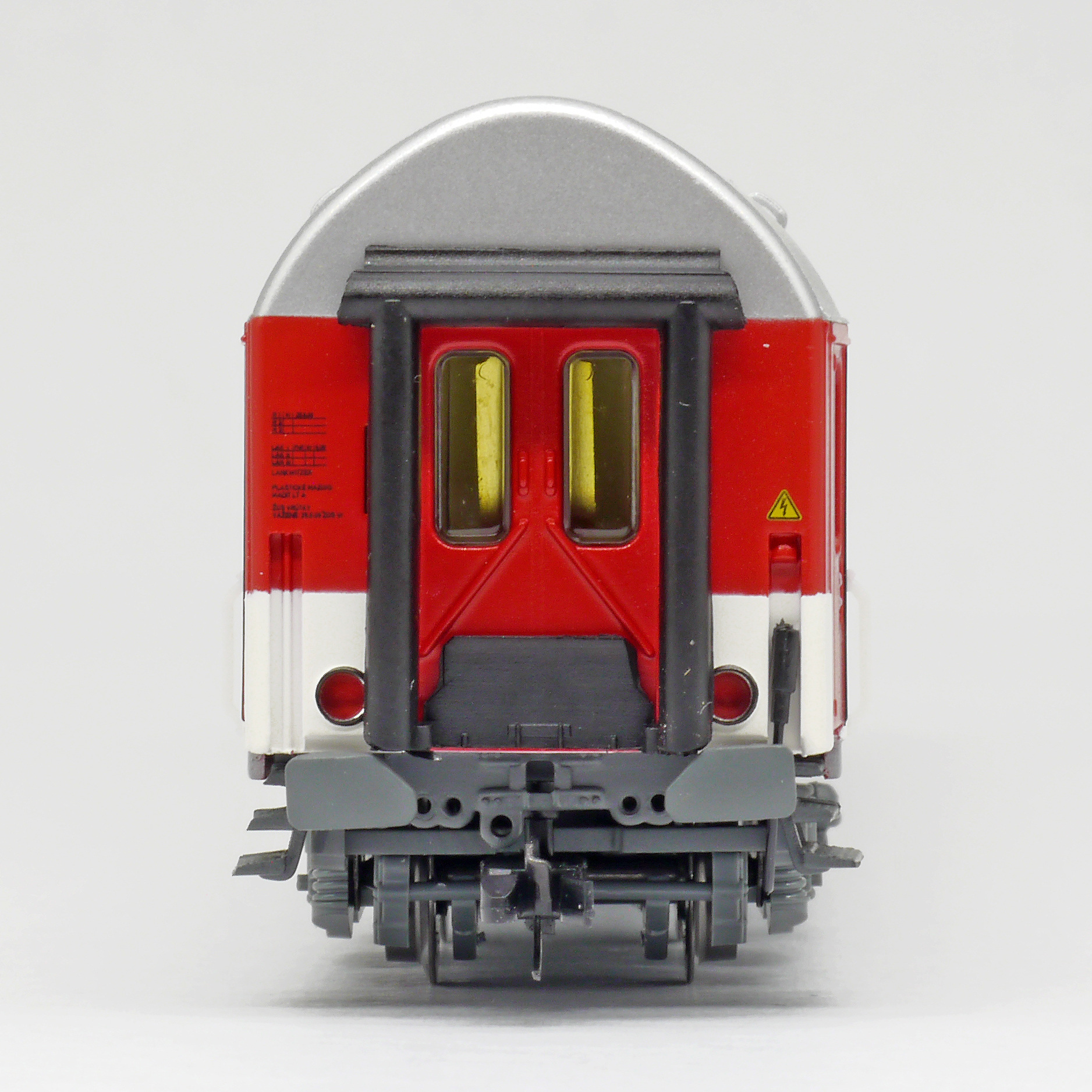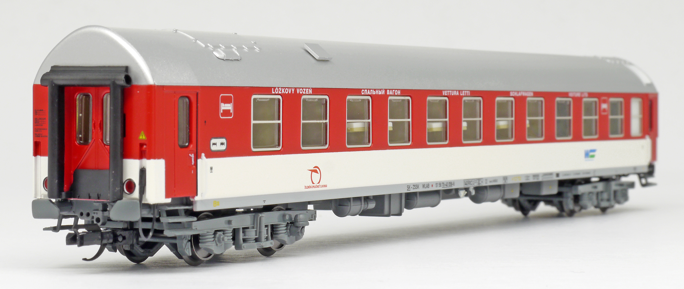 | lůžkový vůz červený-bílý se stříbřitou střechou |