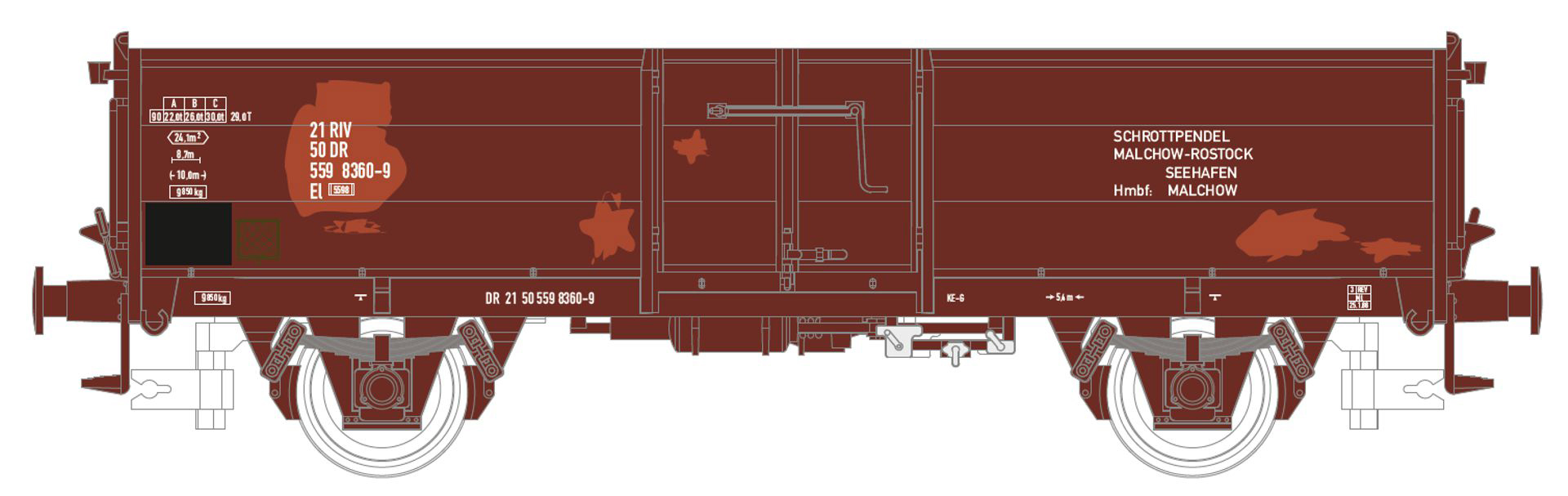 | otevřený nákladní vůz červenohnědý s opravami laku ložený šrotem |