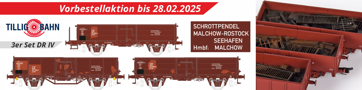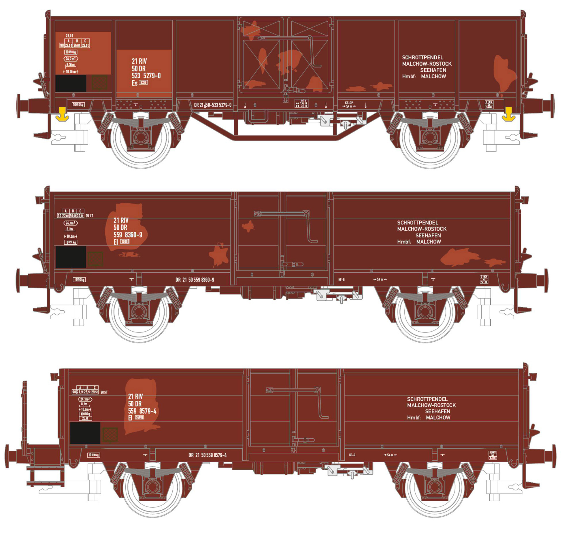 | set tří otevřených nákladních vozů s opravami laku ložené šrotem „Schrottpendel Malchow–Rostock“ |