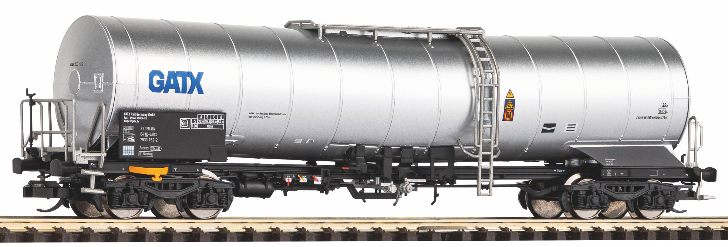 | kotlový vůz stříbrný na přepravu chemikálií s logem „GATX“ |