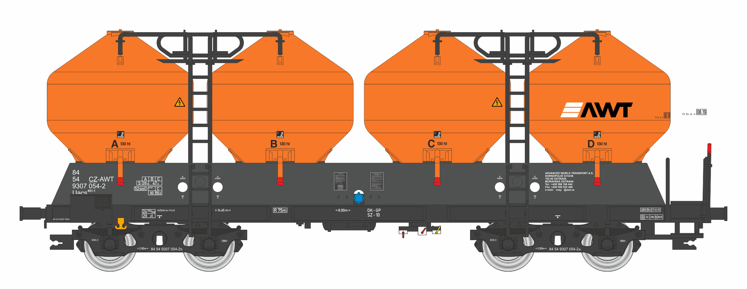 | nákladní samovýsypný vůz černý s oranžovými nádobami „AWT“ |