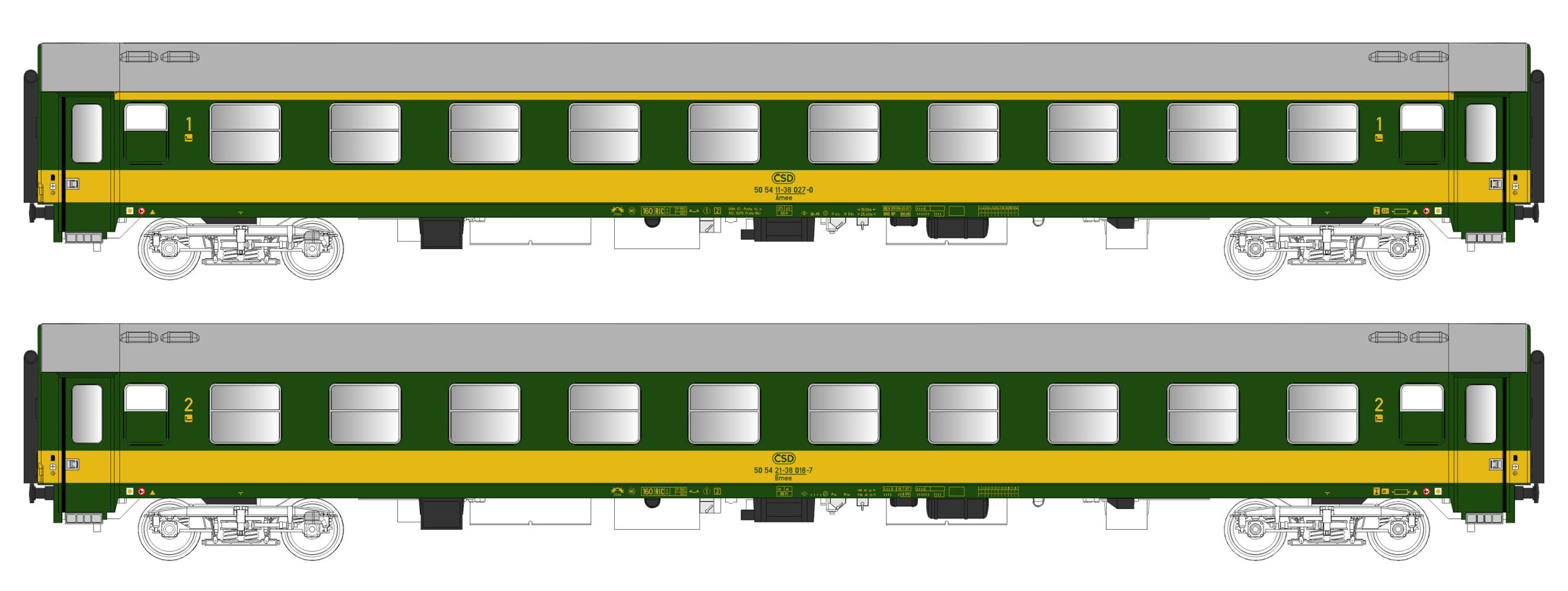 | rychlíkový vůz zelený se žlutým pruhem a šedou střechou 2. tř. |