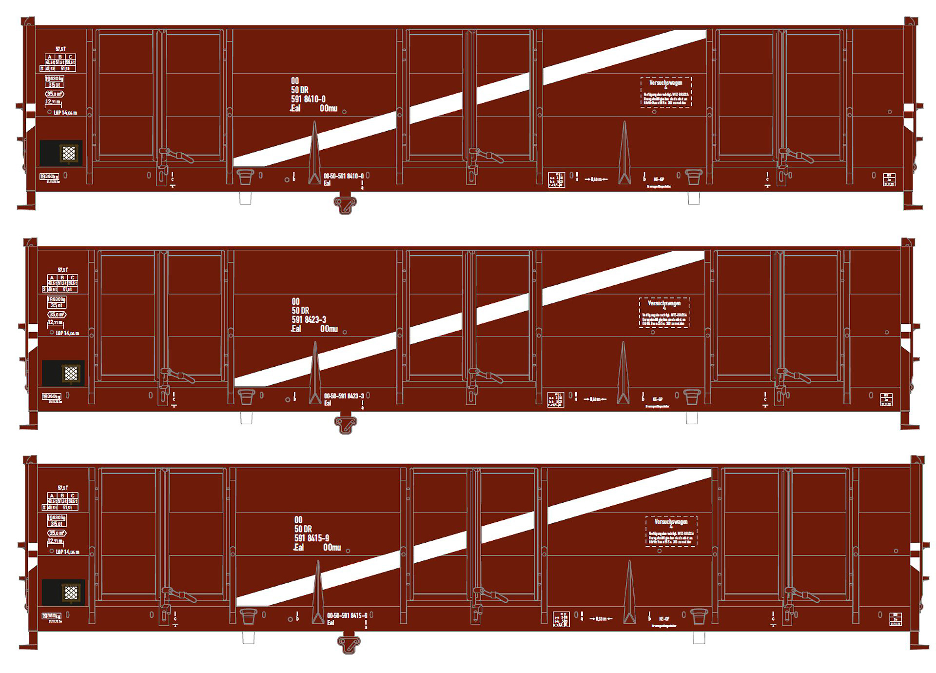 | set tří zkušebních nákladních otevřených vozů s bílým pruhem |