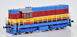 | dieselová lokomotiva červená s výstažným pruhem, světle modrá střecha, rám a pojezdý rám |