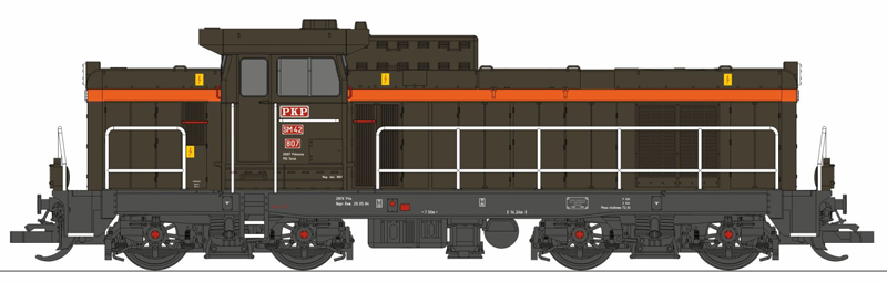 | dieselová lokomotiva tmavě hnědá s oranžovým proužkem, černý rám a pojezd |