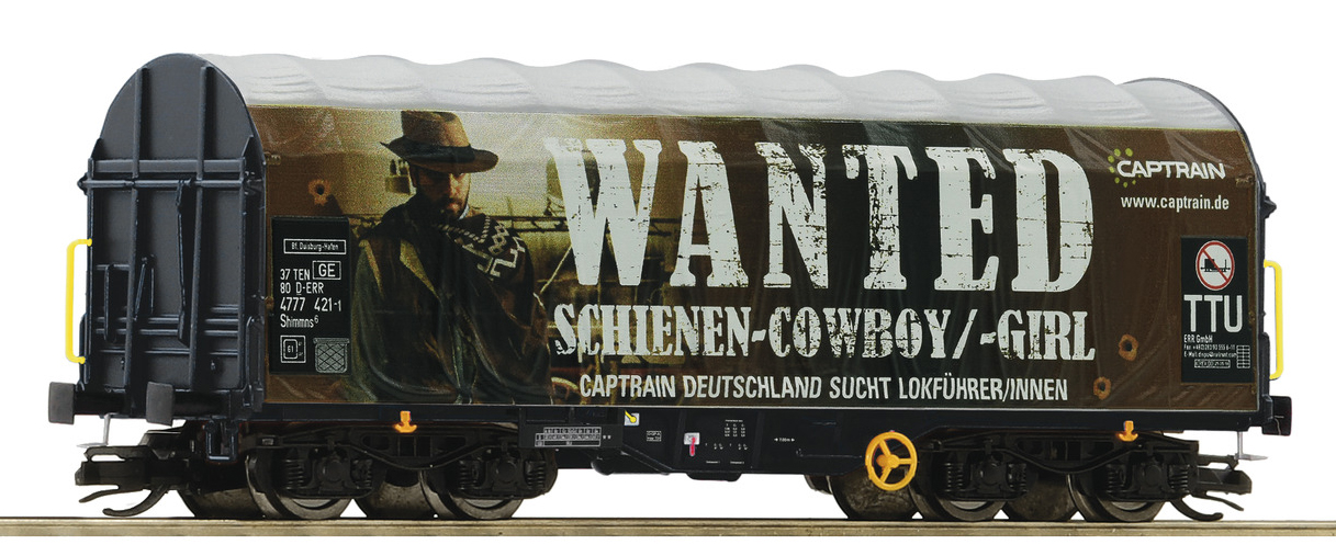 | plošinový nákladní vůz s odsuvnou plachtou s reklamním potiskem „WANTED“ |