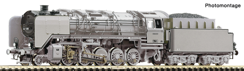 | parní lokomotiva v šedém fotonátěru a s kouřovými plechy |