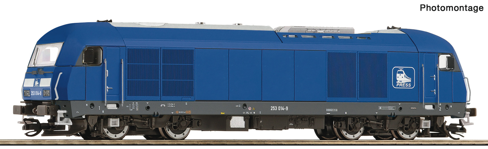 | dieselová lokomotiva modrá s logem „PRESS“ |