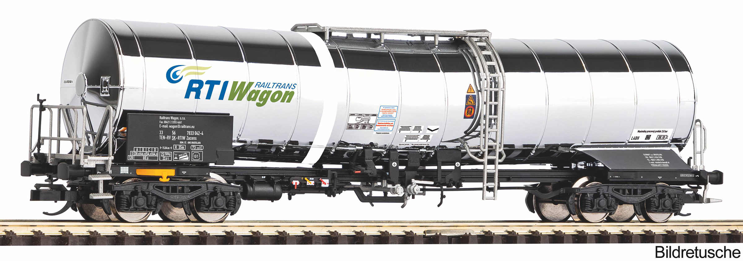 | kotlový vůz stříbrný na přepravu chemikálií s logem „RTI“ |