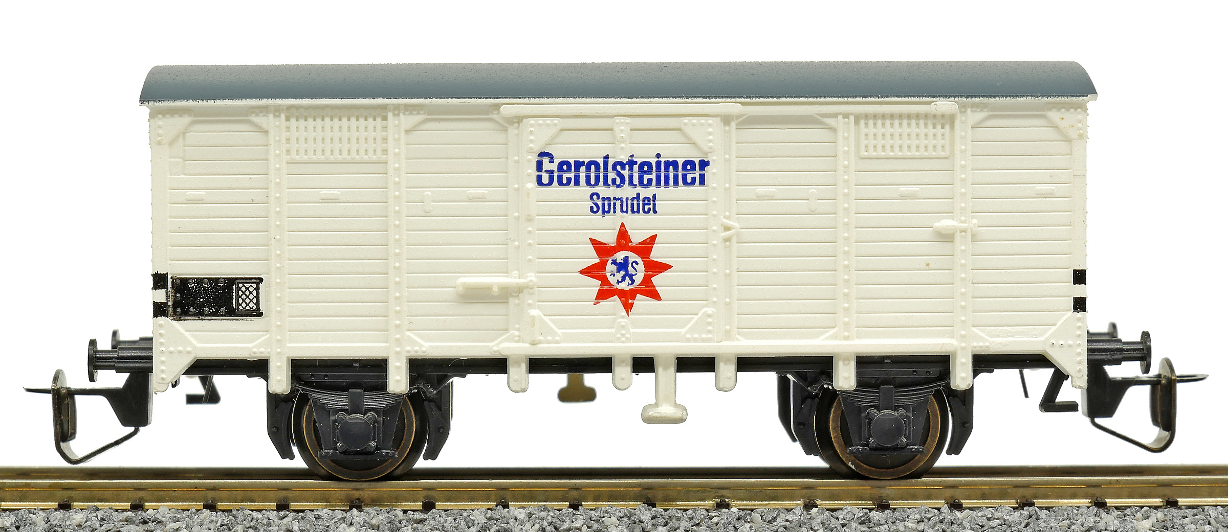 krytý nákladní vůz bílý s šedou střechou „Gerolsteiner“