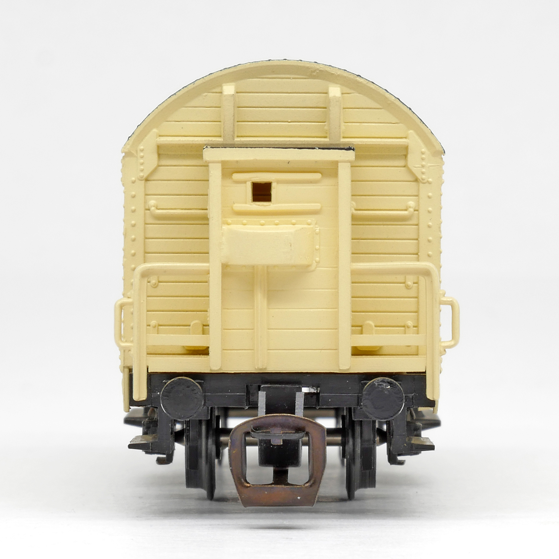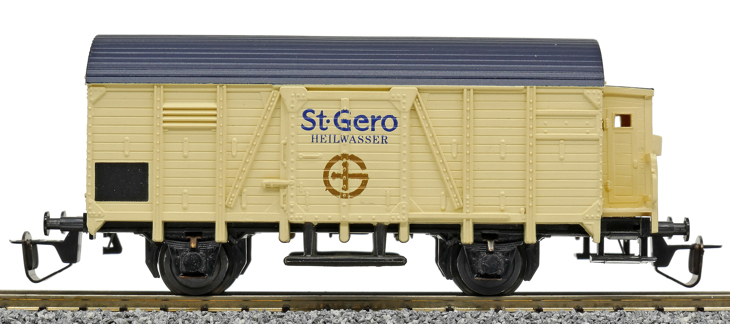 | krytý nákladní vůz krémový s černou střechou a s brzdařskou budkou „St. Gero Heilwasser“ |