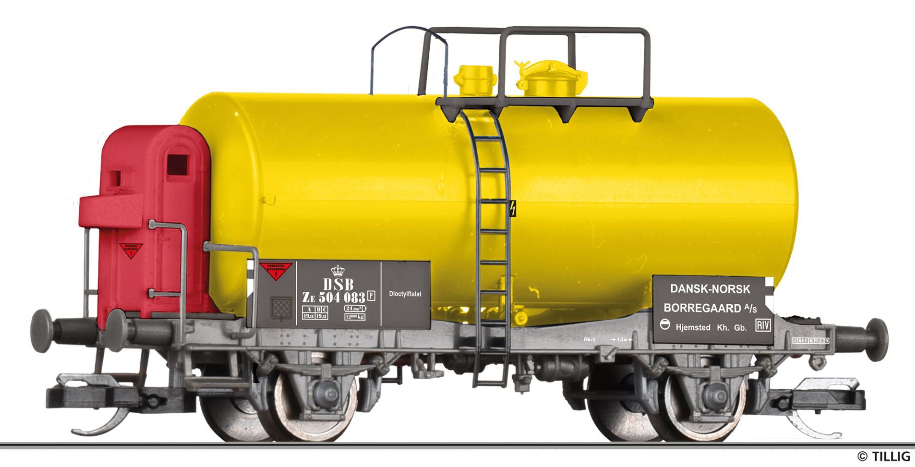 | kotlový vůz žlutý s brzdařskou budkou „Dansk-Norsk Borregaard“ |