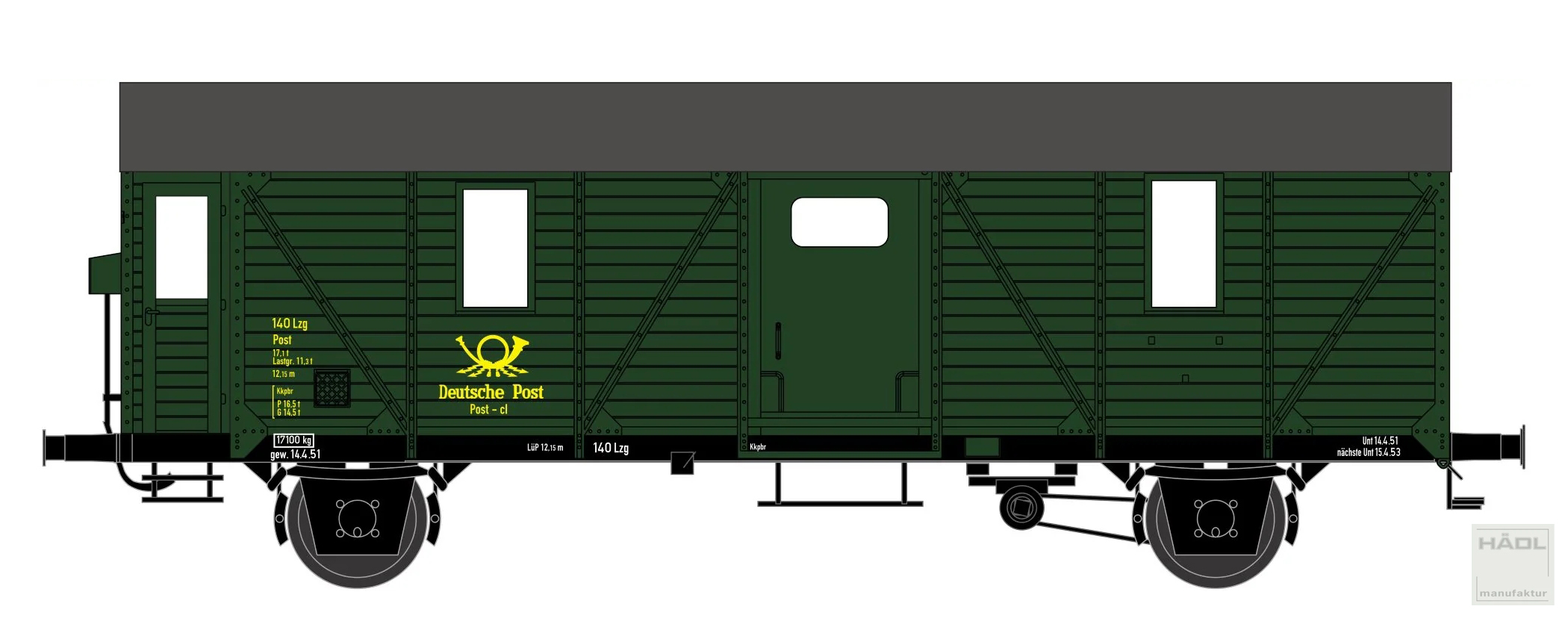 | poštovní vůz tmavě zelený s černou střechou |