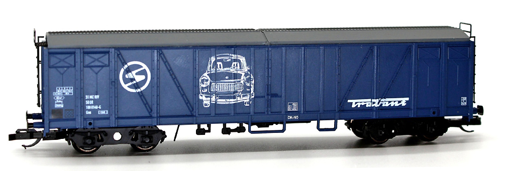 | krytý nákladní vůz modrý s šedou střechou a s reklamou „Trabant“ |