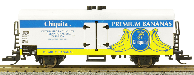 nákladní chladící vůz se bílou střechou s reklamním potiskem „Chiquita PREMIUM BANANAS“