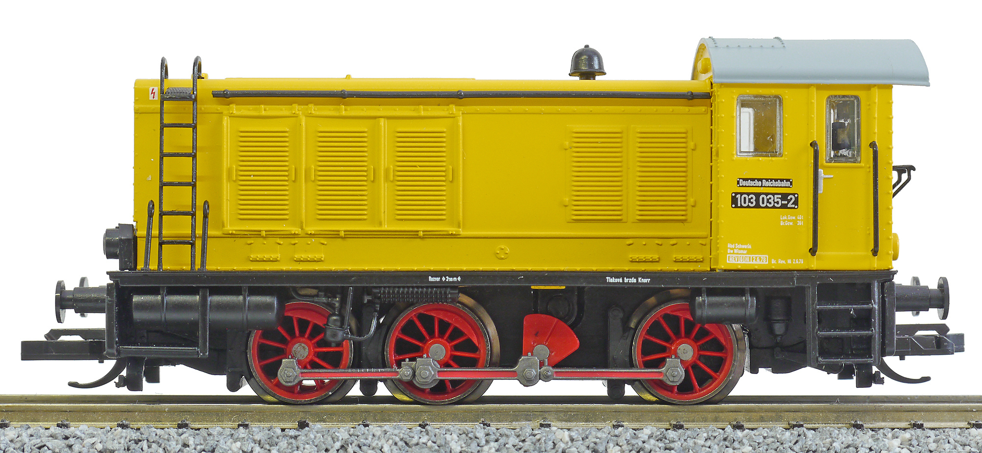 | dieselová lokomotiva žlutá s šedou střechou, černý rám |