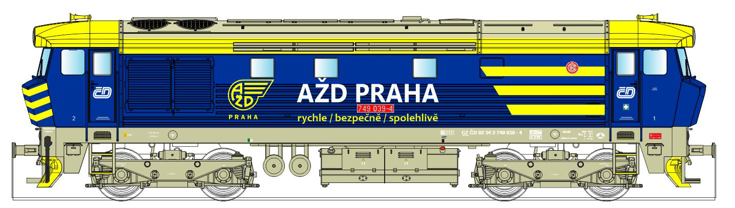 Popis   dieselová lokomotiva v barevném schematu „AŽD“