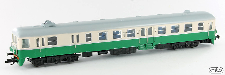 Kód   PKP-SN61-174  [Lokomotivy] → [Motorové vozy a jednotky] → [SN61] → PKP-SN61-174: motorový vůz tmavě zelený-světle zelený s šedou střechou, výstražný pruh na čelech