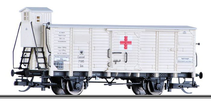 | krytý nákladní vůz bílý s šedou střechou z lazaretního vlaku „Vereins-Lazarettzug“ |