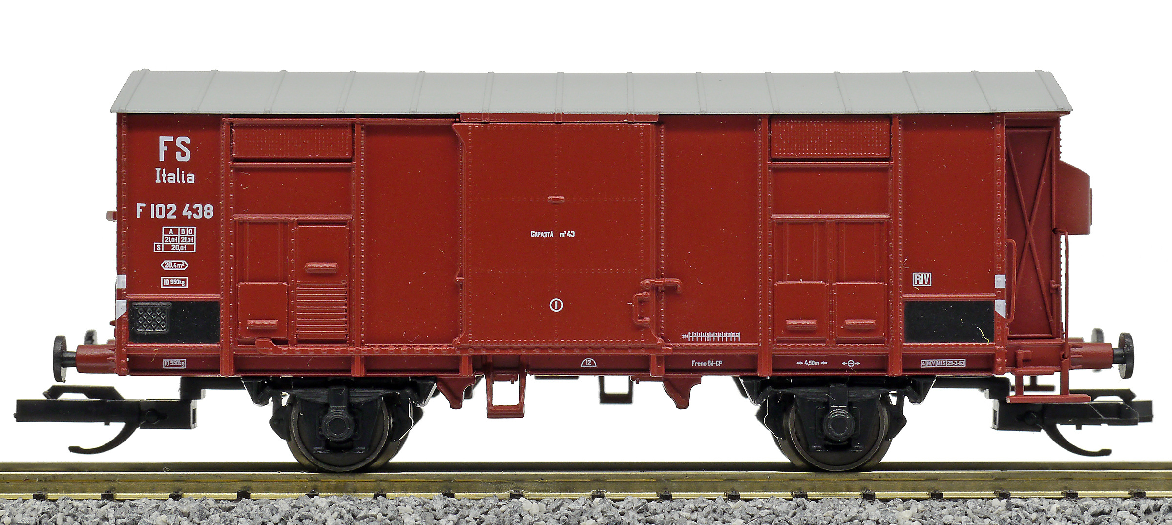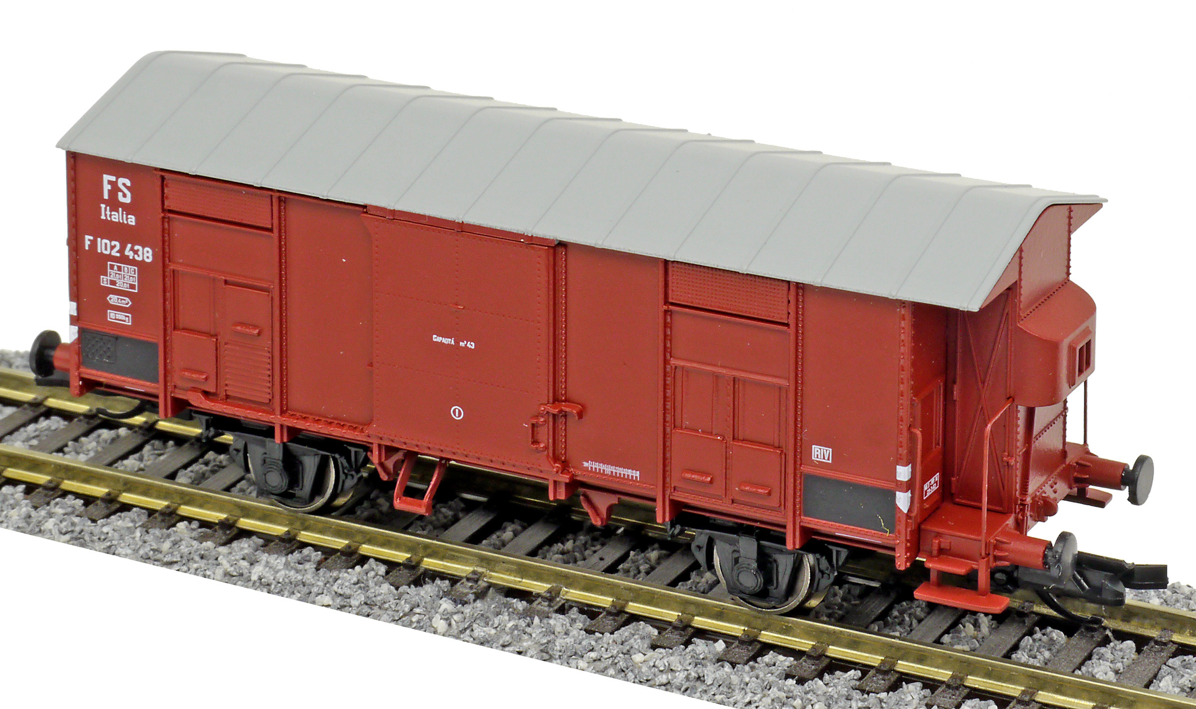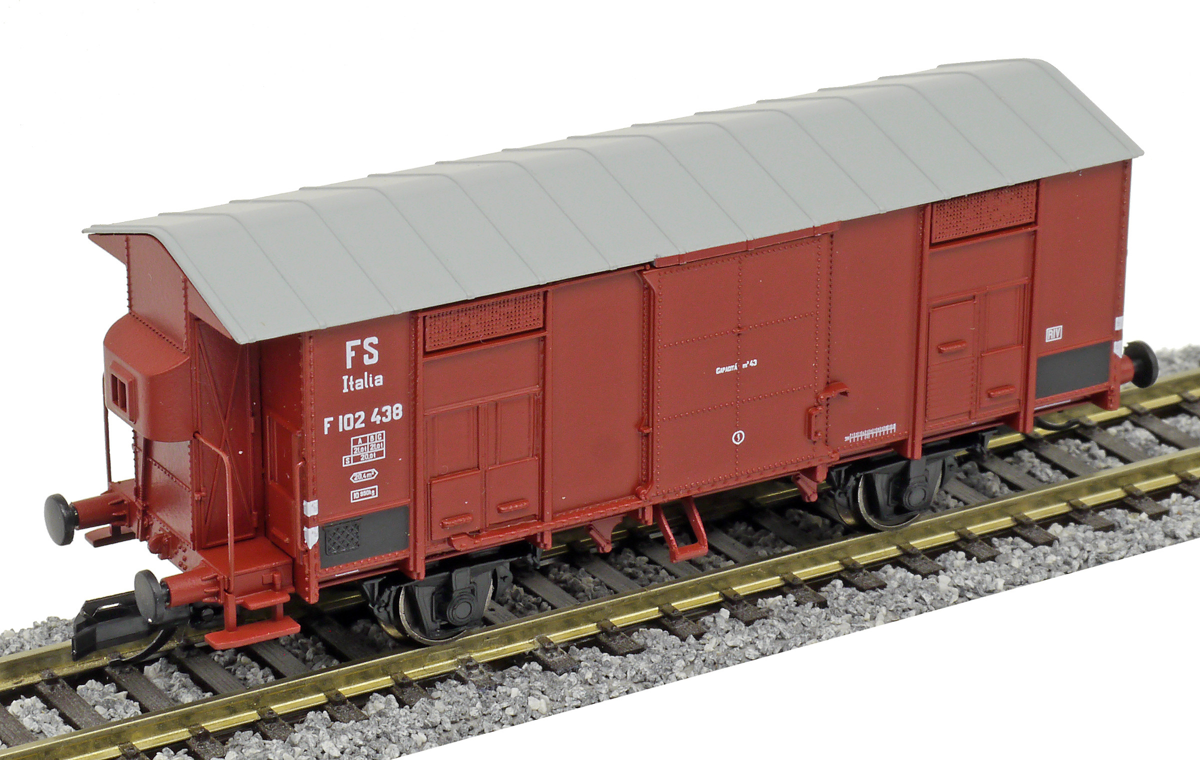 Kód   84002  [Nákladní vozy] → [Kryté] → [2-osé F] → 84002: krytý nákladní vůz červenohnědý s šedou střechou, RIV EUROP