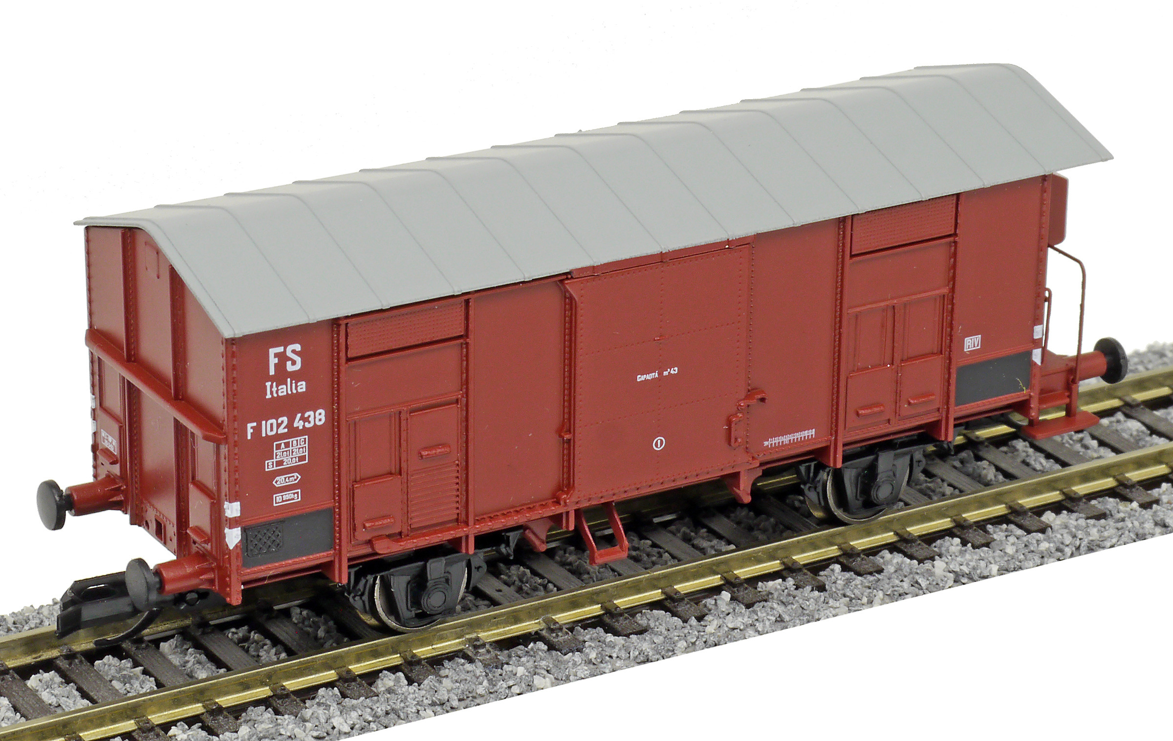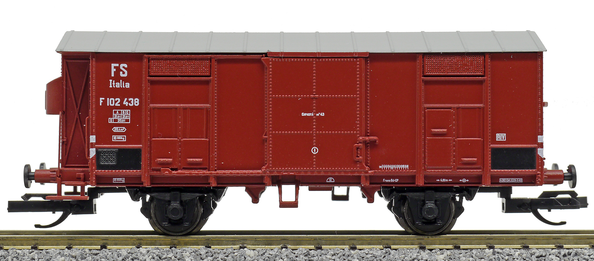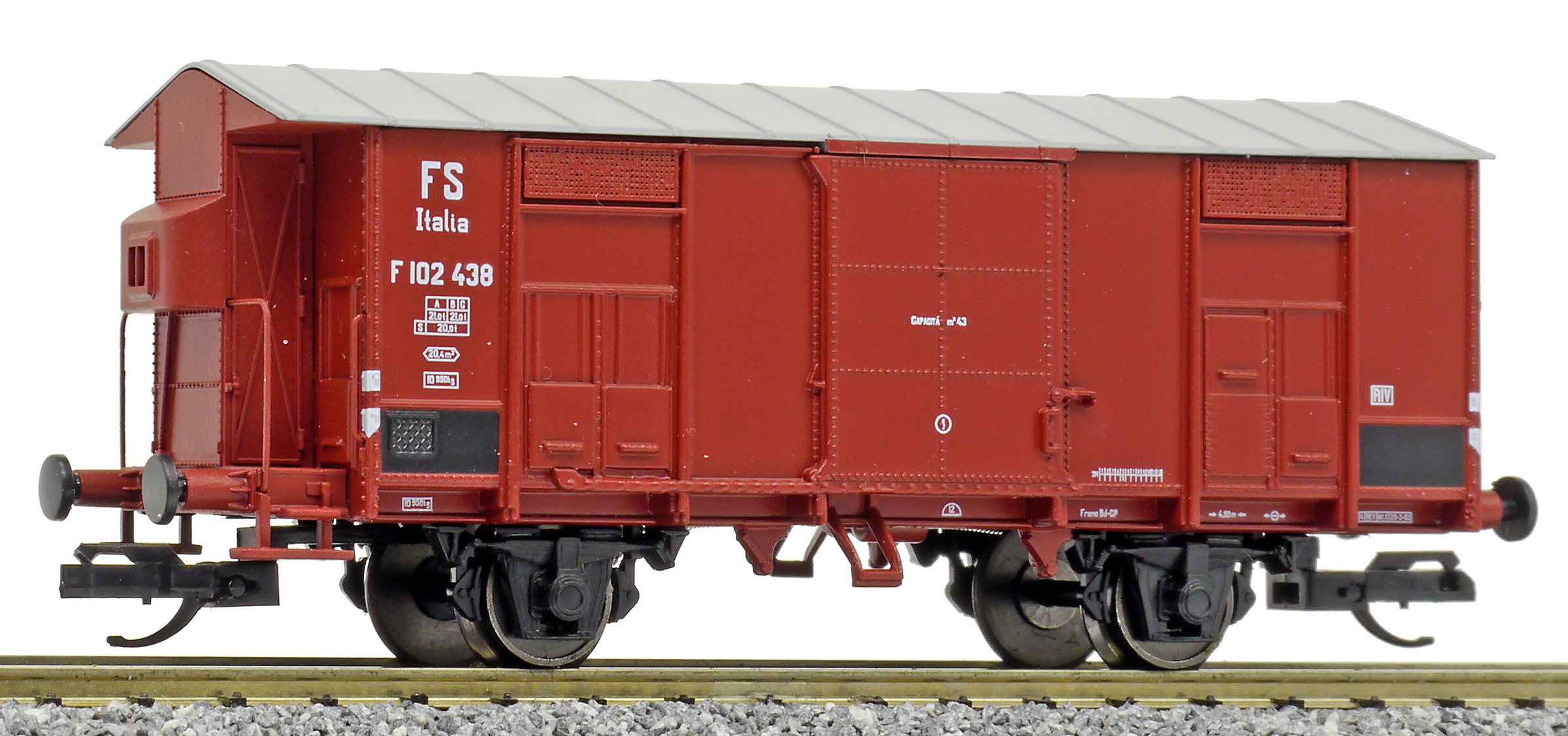 Kód   84002  [Nákladní vozy] → [Kryté] → [2-osé F] → 84002: krytý nákladní vůz červenohnědý s šedou střechou, RIV EUROP