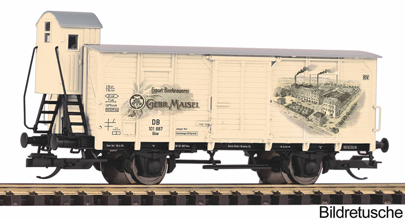 | krytý nákladní vůz krémový s šedou střechou a s brzdařskou budkou „Gebr. Maisel“ |
