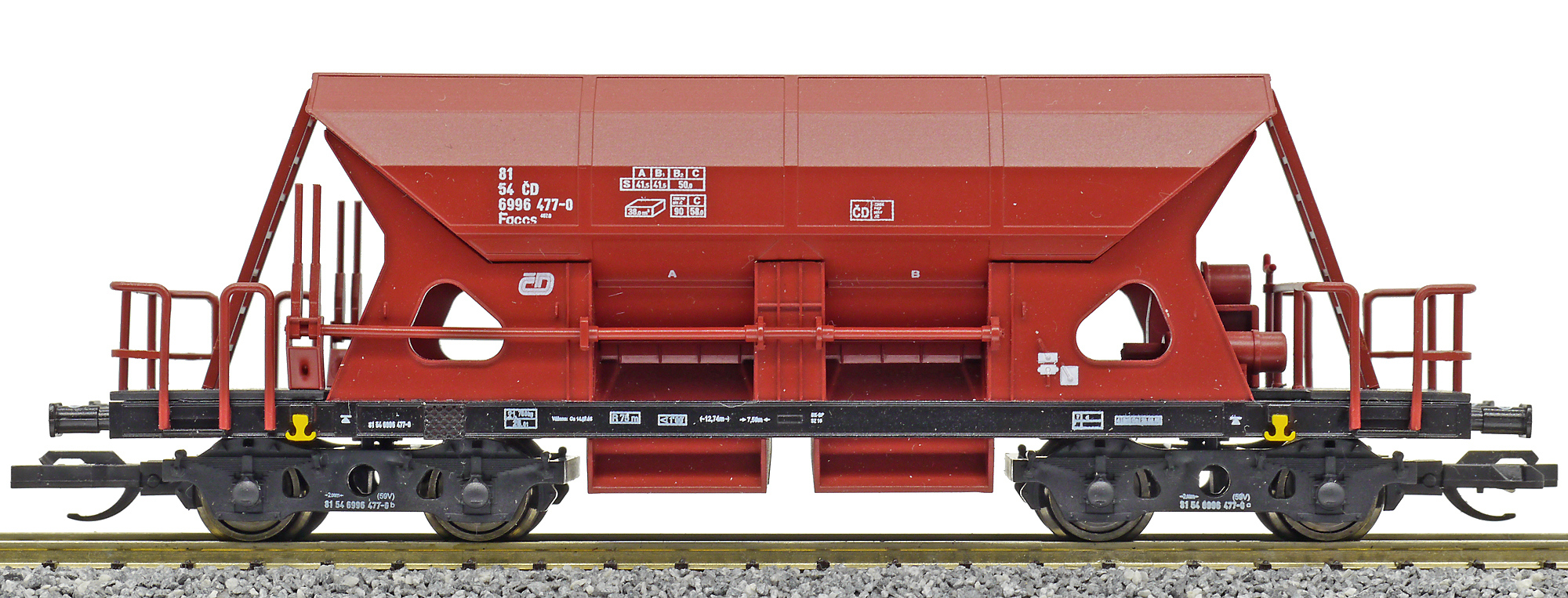 Kód   96500012  [Nákladní vozy] → [Samovýsypné] → [4-osé Faccs (Sas)] → 96500012: otevřený samovýsypný vůz červenohnědý „OKD-DOPRAVA“