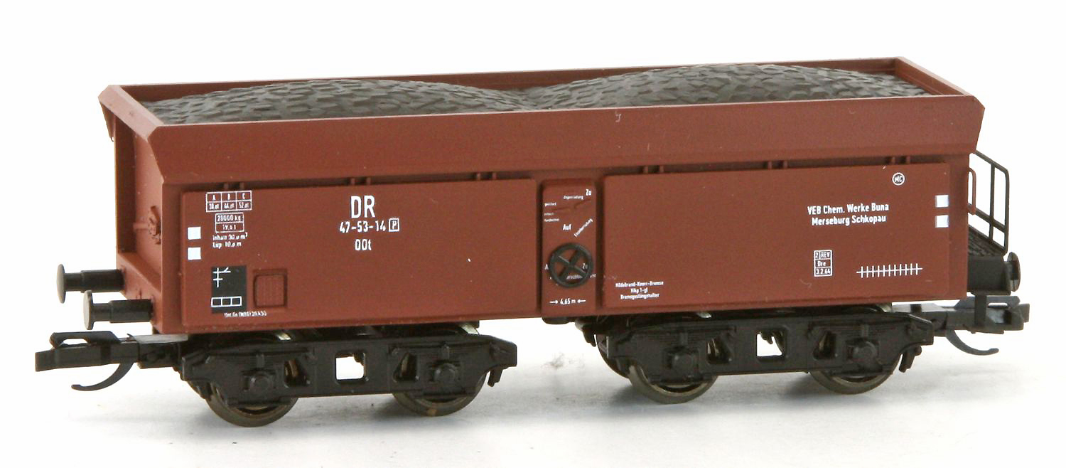 | nákladní samovýsypný vůz červenohnědý „Bunawerke“ s nákladem hnědého uhlí |