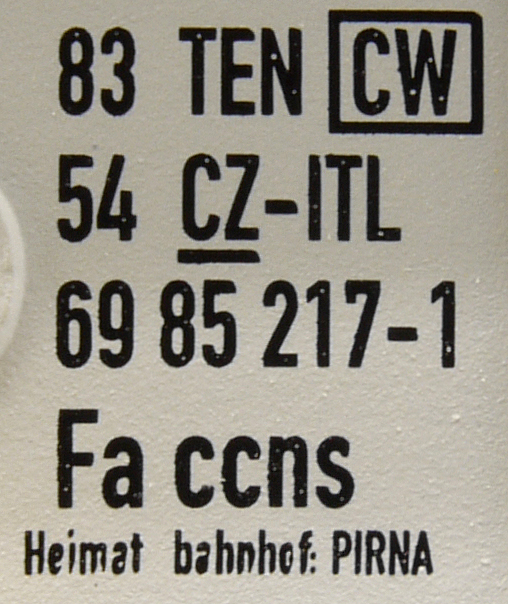 | • 83 54 69 85 217-1 | → | nákladní, s podvozky, soukromý vůz, pro mezinárodní dopravu dle zvláštních úmluv |