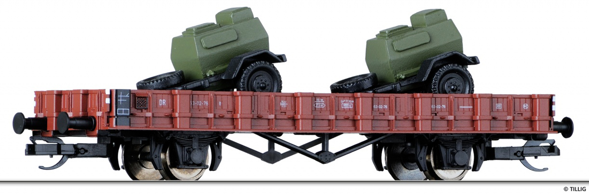 | nízkostěnný vůz červenohnědý se dvěma přívěsnými vozíky na vodu |