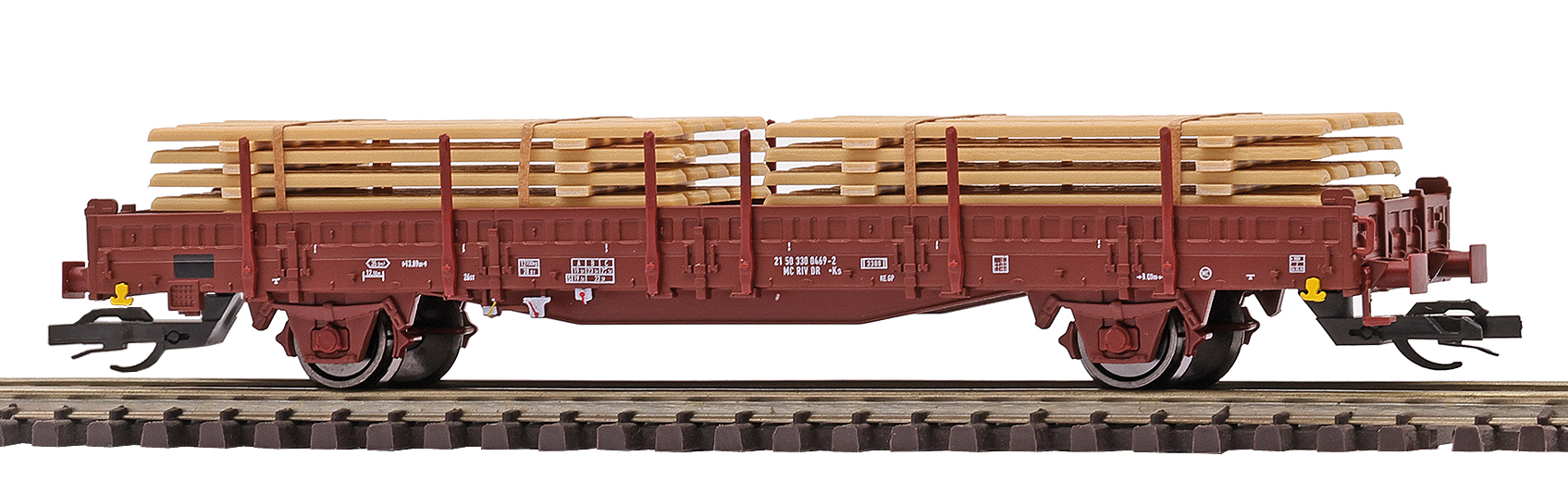 | nízkostěnný nákladní vůz červenohnědý s klanicemi s nákladem stohů desek |