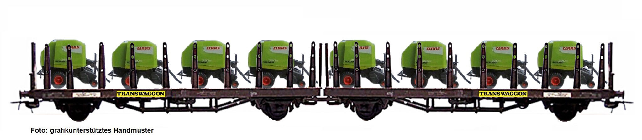 dvojdílný plošinový nákladní vůz červenohnědý s nákladem lisů na kulaté balíky