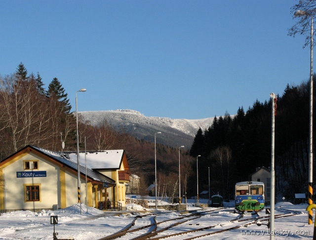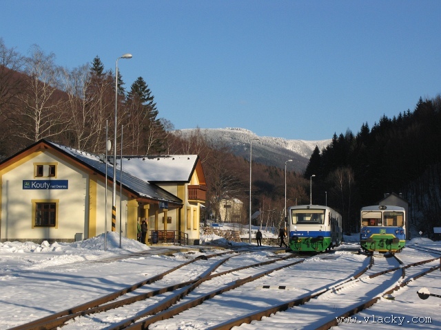 V Koutech nad Desnou chvíly pózovala nová souprava s původním motorovým vozem. Ten po chvíli v 14.12 odjížděl zpět do Šumperka jako Os 13771. Souprava ještě zajela až téměř k zarážce na konci trati a do svého plánovaného odjezdu v 14.40 se vyhřívala na slunci. Díky vyšší nadmořské výšce a více sevřenému údolí se zde sněhová nadílka drží i v těchto slunečních dnech.