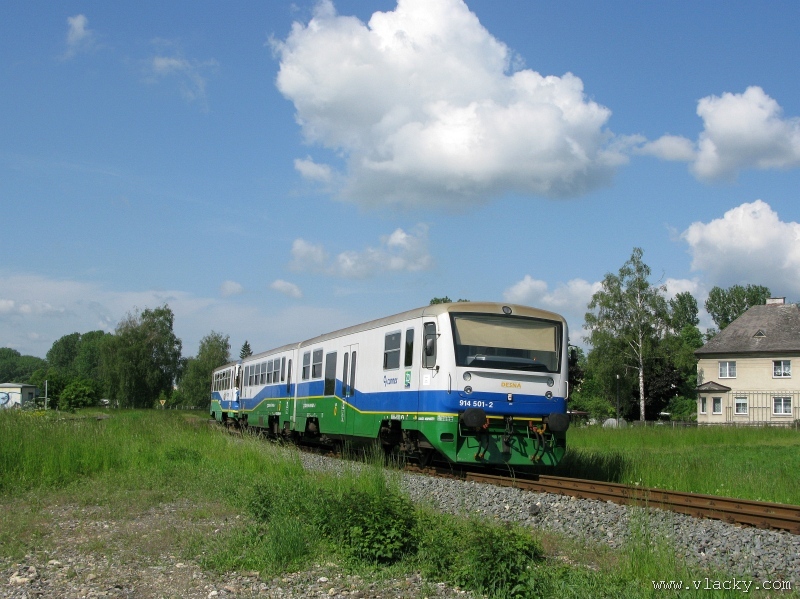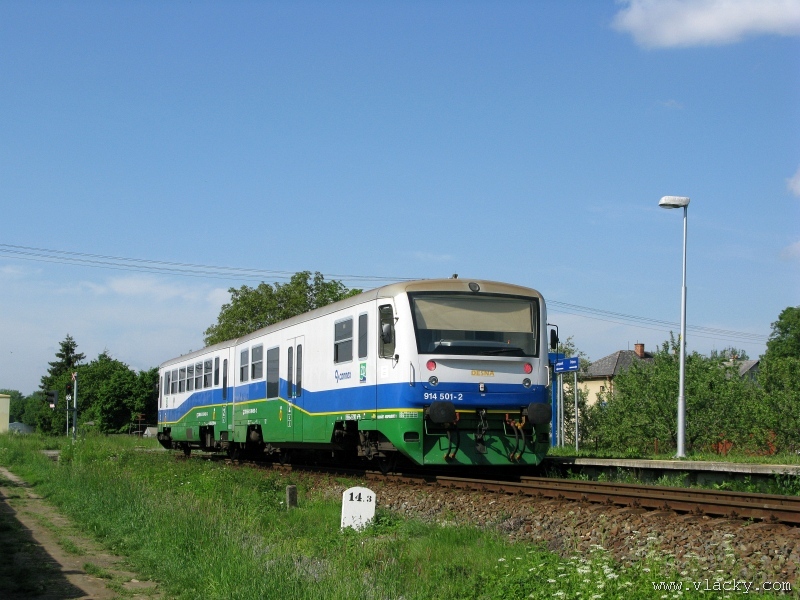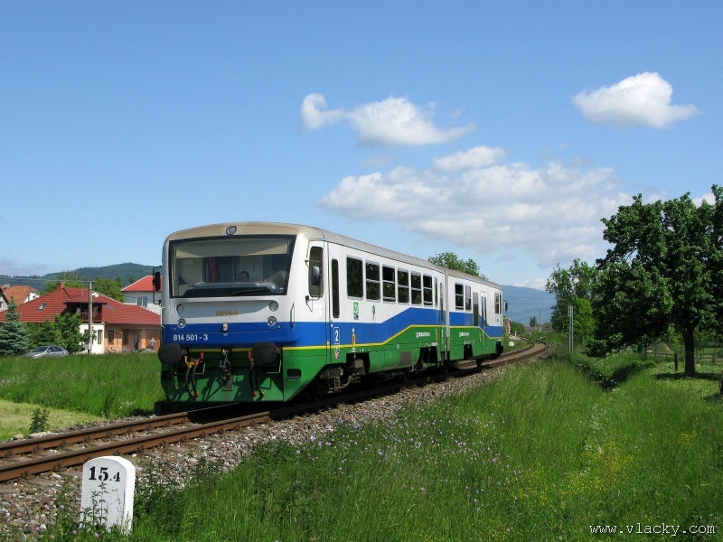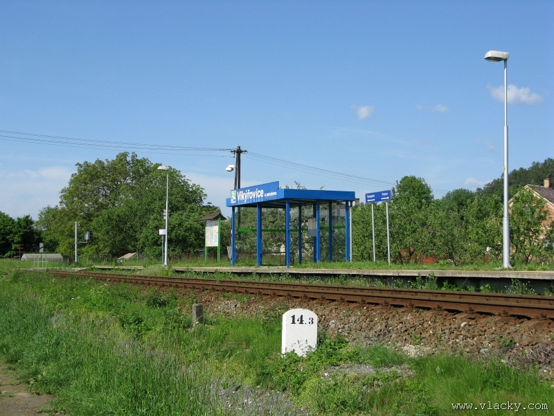 Železnice Desná   Po nedávné projížďce podél trati Železnice Desná údolím od Petrova nad Desnou až do Koutů nad Desnou jsem tentokrát zamířil opačným směrem. Trať z Petrova nad Desnou do Šumperka vede relativně nenáročným rovinatým terénem mezi poli na okraji vesnice Vikýřovice. Na relativně krátkém úseku trati přibližně 6 km jsou mezi stanicemi Petrov nad Desnou a Šumperk další tři zastávky vzdálené od sebe téměř na dohled.