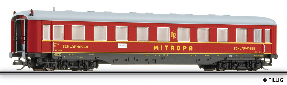 | lůžkový vůz červený s šedou střechou „Mitropa“ |