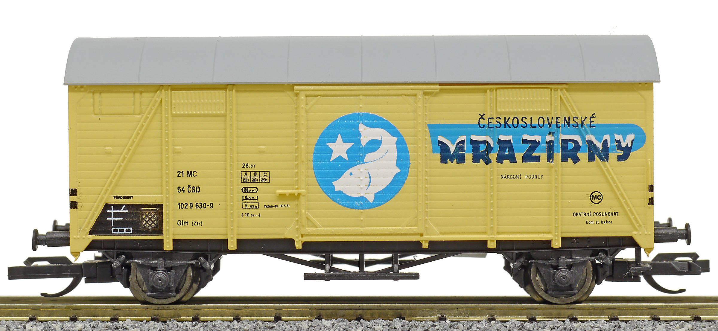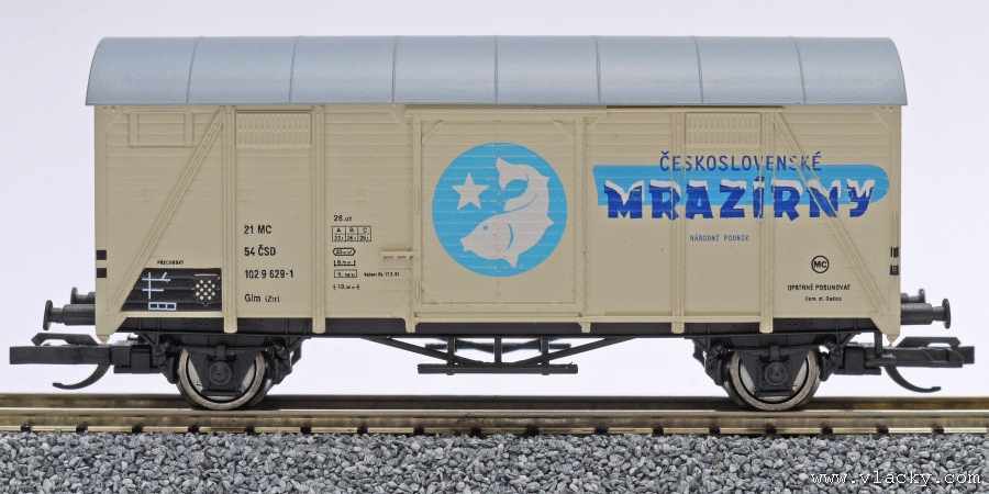 | krytý nákladní vůz krémový s šedou střechou „Československé mrazírny”, logo ryba |